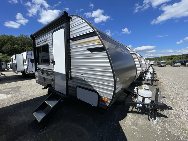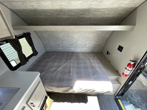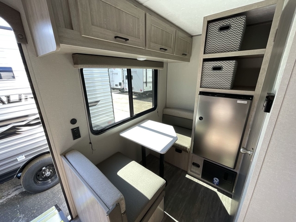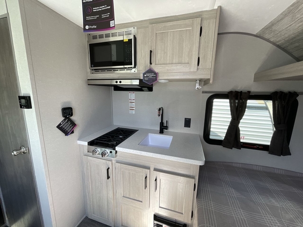 This lightweight travel trailer includes everything you need for comfortable camping trips at the lake. You can make your meals on the two burner cooktop or in the stainless steel microwave, and a 3.3 cu. ft. 12V refrigerator will keep leftovers fresh. A front queen bed provides a great night's rest, and there is a 29" booth dinette that will double as both dining and additional sleeping space. And a private bath with a 24" x 32" shower and toilet will let you easily freshen up without having to use the camp's facilities!