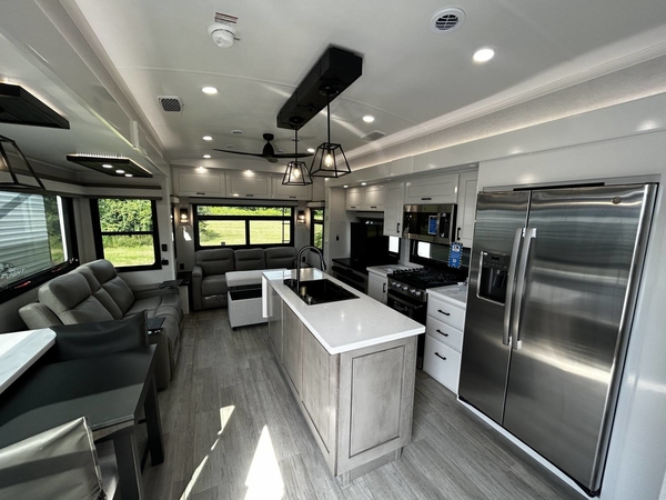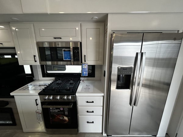 Step inside and experience the Jayco difference. From handcrafted solid hardwood maple cabinetry to sleek solid-surface countertops, every detail reflects intentional design and superior build quality. GEs premium kitchen suite includes a 21 cu. ft. residential refrigerator, a 30 in. convection microwave with built-in air fryer, and a 24 in. high-output rangealong with an available built-in dishwasher and extended bar top for effortless entertaining.