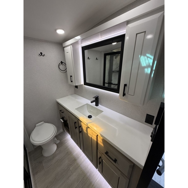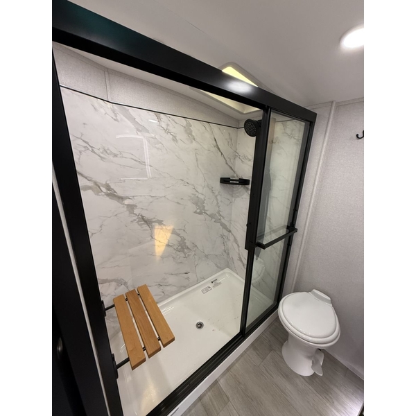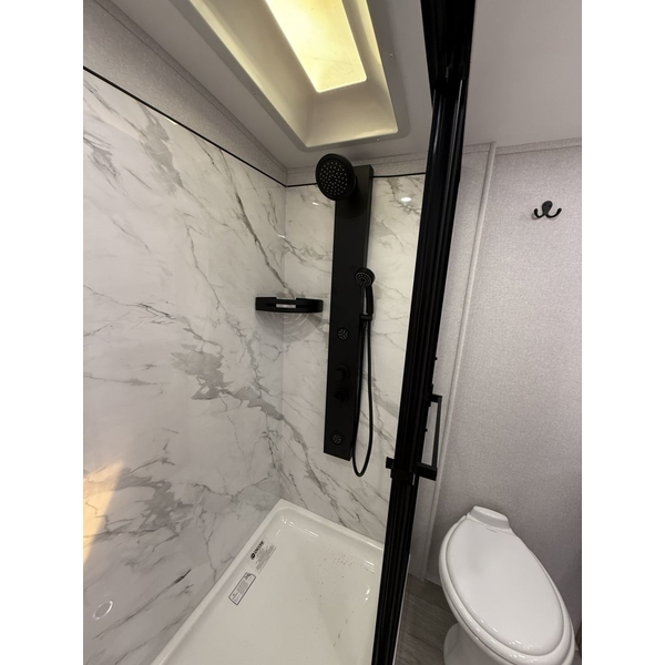 Pinnacle also features the AquaLuxe packagea premium setup that includes a high-capacity tankless water heater, (3) 40-lb. propane bottles for extended use, and the NuvoH2O filtration system. Together, they deliver instant hot water, longer off-grid capability and consistently cleaner, better-tasting water throughout the coach.