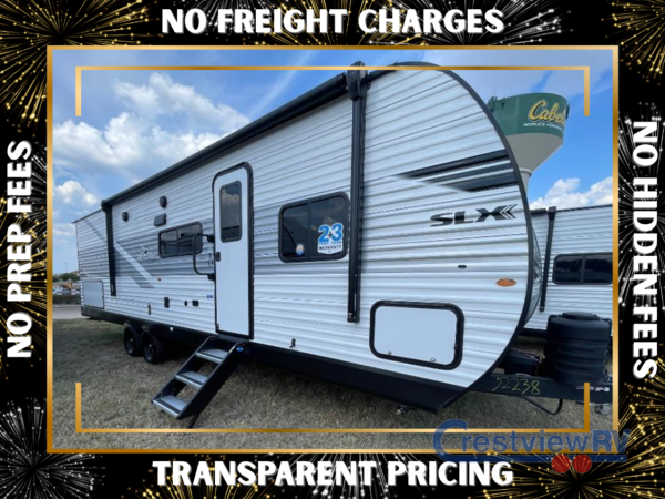 The Jayco Jay Flight SLX travel trailer is quite easy to own because it is lightweight for an easier towing experience. Built on a fully integrated A-frame with galvanized-steel, impact-resistant wheel wells, the Jay Flight SLX has quality at its very foundation. That quality continues on to the electric self-adjusting brakes, easy-lube hubs, Magnum Truss roof system, and LP quick connect. Some of what the mandatory Customer Value Package includes is backup camera prep, Keyed-Alike entry and baggage doors, and an on-demand tankless water heater