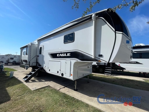 With any Eagle fifth wheel by Jayco you will appreciate durable construction materials, like the Magnum Truss Roof and the Stronghold VBL laminated walls. The JAYCOMMAND Smart RV system puts you in control of your RV's functions, and the 5 Star Handling Package will provide smooth towing from home to camp. Each model features Climate Shield zero-degree tested weather protection and the industry-exclusive HELIX cooling system that features two 15,000 BTU Whisper Quiet A/C's to keep you comfortable year around. Some of the exterior conveniences you are sure to love are the pass-through storage with Slam-Latch baggage doors and an automotive style front cap with max turn radius. The Eagle fifth wheels are designed to make you feel at home with solid hardwood slide fascia, residential vinyl flooring throughout, 100% no floor vents, and blackout roller shades with reflective side throughout for added privacy and insulation.