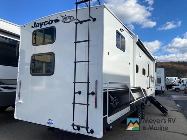With any Eagle HT fifth wheel or travel trailer by Jayco you will enjoy a smooth drive thanks to the 4 Star Handling Package and MORryde CRE-3000 rubberized suspension. The Customer Value Package includes amenities that are sure to make camping easier than ever, like the 60K on-demand water heater, Keyed-Alike lock system, 15,000 BTU "Whisper Quiet" A/C, and more. Handcrafted door/drawer fronts will make your space feel more like home, along with residential vinyl flooring throughout, GE appliances, and blackout roller shades with reflective side throughout to keep the sun out when you want to sleep in. Each model also includes a NuVo H2O water treatment system with filters included, interior and exterior "Blue Sync" audio connect with MB Quart Sound for your TV and phone, and 100% no floor vents for added comfort and convenience!