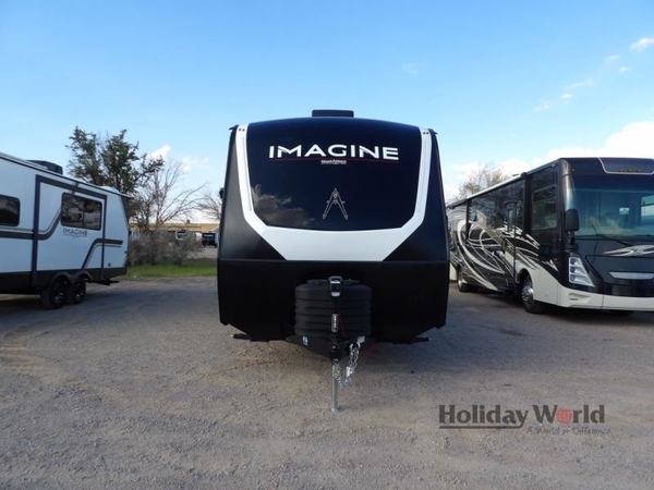This Imagine travel trailer has opposing slides to provide you with ample living space on the interior once you've parked and set up! You can use the tri-fold sofa and theater seating to relax, and the booth dinette is another seating space that you can use for dinner time or game nights. The entertainment center has a LED HDTV with fireplace below, which is great for movie night.  When outside, you will love the two power awnings to sit beneath to keep you protected from the sun while you have fun at your campsite. The exterior also offers you an LP quick connect and a coax TV hookup.