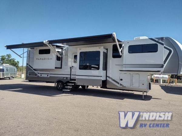 The Paradigm fifth wheels by Alliance RV are functional, high-quality, and luxurious for an unforgettable camping experience. There are three A/C units and a 40K BTU furnace to keep you comfortable year around, and you'll appreciate additional convenient amenities, like the all-in-one enclosed/heated utility center and the color coded and numbered wiring. A Helux Series coil spring pin box comes standard for hassle-free towing, along with Super-G 4,400 lb. rated tires and Dexter 7,000 lb. axles. You'll love the kitchen with its LG solid surface countertops and Lusso range, plus there is LED motion lighting in the pantry and a Maxx fan with a rain sensor to keep everything fresh when making dinner. Each model also includes an HD Smart TV in the living room and bedroom, plus a Winegard Air 360 antenna to keep you connected to the outside world. And of course there are a variety of options you can choose from to further customize your fifth wheel; dual pane windows, Super Solar Plus, slide out awning toppers, and generator prep or a generator to name a few!