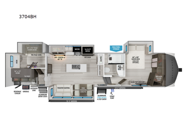 Any Grand Design Influence fifth wheel features five-sided aluminum cage construction with a walk-on roof and a fully enclosed underbelly with heated tanks and storage for all weather camping. For peace of mind, the MORryde CRE3000 Suspension system will provide safe and smooth towing, and the 101" widebody construction offers all the room you need and that is before multiple slides are fully engaged. You will appreciate the Keyed-Alike locks, slam-latch baggage doors with magnetic door catches, exterior security light, and SolidStep entry steps. On the inside, Congoleum flooring, premium roller shades for privacy, a hallway handrail for safety, and nightstands with USB ports to keep all of your electronics fully charged. You will also love the On Demand tankless water heater when showering, plus the added heat and ambiance from an electric fireplace, and so much more!