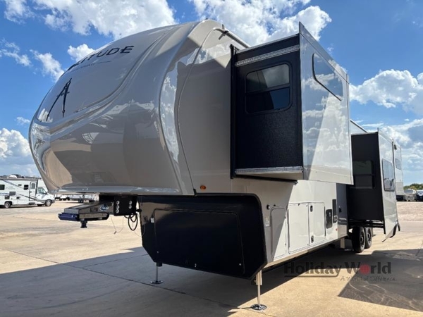 Each Solitude fifth wheel by Grand Design features a 101" wide-body construction, heavy duty 8,000 lb. axles, frameless tinted windows, and high-gloss gel coat sidewalls. You can camp year around thanks to the Weather-Tek Package that includes a 35K BTU high-capacity furnace, an all-in-one enclosed and heated utility center, and a fully enclosed underbelly with heated tanks and storage. Inside, you'll love the premium roller shades, hardwood cabinet doors, solid surface countertops, plus residential finishes throughout to make you truly feel at home. Each model also includes a MORryde CRE3000 suspension system, self adjusting brakes, and a MORryde pin box that will provide smooth towing from home to campground. Affordable luxury is possible with the Solitude fifth wheels; choose yours today!