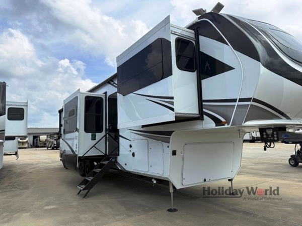 Five slide outs, a full bathroom with dual sinks, a half bath off of the kitchen, and a separate front living room and entertainment area are a few reasons you will enjoy your time spent in this fifth wheel! The separate kitchen is a dream with stainless steel appliances including a built-in oven, a pantry and hutch with counter space, a kitchen island plus a free-standing dinette slide with windows for great views. The entertainment center offers an LED Smart TV with a fireplace below and storage, and the dual opposing tri-fold sofas provide added sleeping space at night. The master bedroom includes a queen bed plus space savings sliding doors that lead you to the rear full bathroom with dual sinks, linen storage, and washer/dryer prep. The exterior has several storage choices as well including a pass-through compartment for fishing poles and such, plus the unique sliding tray in the rear allows you to bring along larger items such as camping tables, portable grills, golf clubs, totes and more.