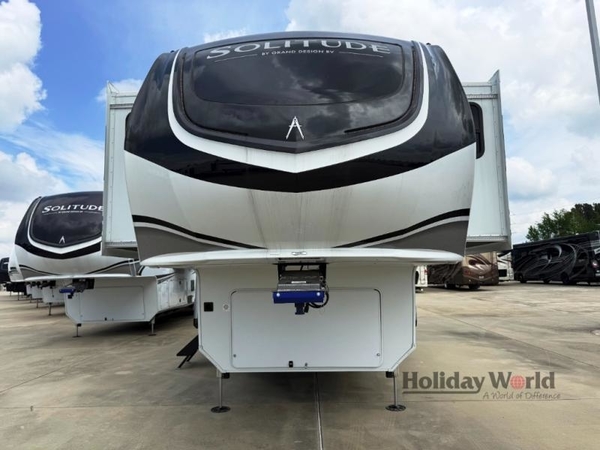 Each Solitude fifth wheel by Grand Design features a 101" wide-body construction, heavy duty 8,000 lb. axles, frameless tinted windows, and high-gloss gel coat sidewalls. You can camp year around thanks to the Weather-Tek Package that includes a 35K BTU high-capacity furnace, an all-in-one enclosed and heated utility center, and a fully enclosed underbelly with heated tanks and storage. Inside, you'll love the premium roller shades, hardwood cabinet doors, solid surface countertops, plus residential finishes throughout to make you truly feel at home. Each model also includes a MORryde CRE3000 suspension system, self adjusting brakes, and a MORryde pin box that will provide smooth towing from home to campground. Affordable luxury is possible with the Solitude fifth wheels; choose yours today!