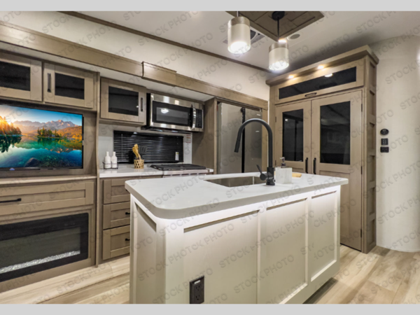 Travel to see new state parks, RV resorts or your family in other states as you tow this fifth wheel to each destination! You will enjoy comfort and convenience, plus a place to work, and be able to offer extra sleeping space for friends and family when they visit. The middle extra room provides a tri-fold sofa slide, a desk, a wardrobe, plus a 64" x 88" upper bed loft area with access from the hallway. The full bathroom will keep everyone refreshed, and the front bedroom allows you to sleep on a queen bed slide or choose the king option. And you will love the front wardrobe, the dresser, and the option to add a washer/dryer. The main living and kitchen area provides plenty of seating from the rear tri-fold sofa, the booth dinette or swivel dinette option, and the theater seats with cupholders. And the kitchen island, appliances, and large pantry allow you to take everything you need with you.