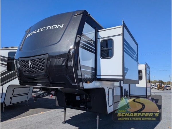 With any Reflection fifth wheel by Grand Design, you will have a solar panel for off-grid camping and a 60 amp charge controller and inverter prep, a Universal All-In-One docking station, unobstructed pass-through storage, and Goodyear Endurance tires. Each is constructed of gel coat exterior sidewalls, residential 5" truss rafters, walk-on roof decking, a fiberglass and radiant foil roof and front cap insulation plus laminated aluminum framed side walls, roof and end walls in slide rooms. Head inside to enjoy residential hardwood cabinet doors, premium Congoleum flooring, a spacious shower with a glass door, and many more comforts!