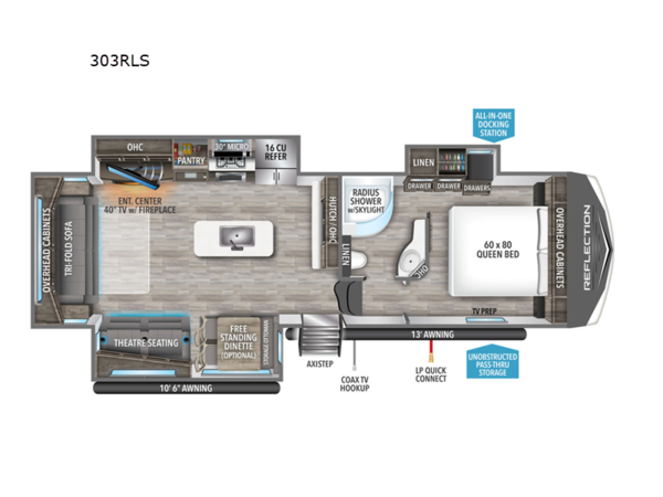 The Reflection 303RLS by Grand Design is a luxury fifth wheel designed for travelers who want residential comfort on the road. Whether you're camping for fun or working remotely, this model offers a spacious layout with a rear tri-fold sofa and theater seating directly across from a 40" LED HDTV and fireplace, creating a cozy living area perfect for relaxing or entertaining.