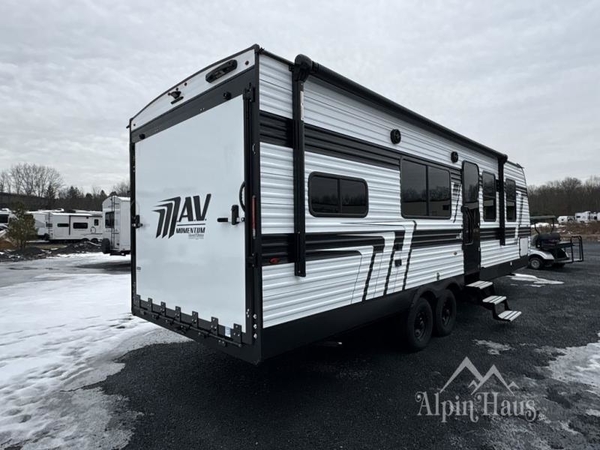 The Momentum MAV toy hauler travel trailers by Grand Design are designed to provide exactly what you need. The spacious garage provides tons of cargo space, with no wheel wells to get in the way. Additional storage includes magnetic storage door catches, and overhead consoles throughout. Conveniences like motion sensor lights and USB outlets will make your life easier, and you will be comfortable in all seasons with the 30K BTU furnace plus 15K BTU ducted air conditioning. The standard Solar Package comes with a 180W solar panel, a 40 Amp charge controller with Bluetooth, and a 12V refrigerator so you can go off-grid when the adventure calls for it.