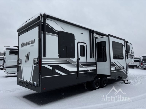 Are you looking for adventure and fun? The Momentum G-Class toy hauler by Grand Design will help you find it! You can explore during any season you choose with the Insulation Package that includes a heated and enclosed underbelly with suspended tanks, a high-capacity furnace, a moisture barrier floor enclosure, and cabinet-mounted heat ducts. Each model includes a fuel station with an interior and exterior gauge, a dovetail rear rend, and 2,500-LB tie-downs anchored into the chassis. Throughout the Momentum G-Class interior, you'll enjoy many comfortable features like large panoramic windows, a shower skylight, USB chargers in the bedroom, and residential cabinetry.