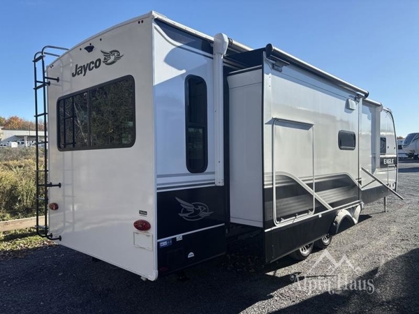 With any Eagle fifth wheel or travel trailer by Jayco you will appreciate durable construction materials, like the Magnum Truss Roof and the Stronghold VBL laminated walls. The JAYCOMMAND Smart RV system puts you in control of your RV's functions, and the 5 Star Handling Package will provide smooth towing from home to camp. Each model features Climate Shield zero-degree tested weather protection and the industry-exclusive HELIX cooling system that features two 15,000 BTU Whisper Quiet A/C's to keep you comfortable year around. Some of the exterior conveniences you are sure to love are the fully enclosed, LED-lit universal docking station, the pass-through storage with Slam-Latch baggage doors, and an automotive style front cap with max turn radius. The Eagle fifth wheels and travel trailers are designed to make you feel at home with solid hardwood slide fascia, residential vinyl flooring, a bathroom skylight, and plenty of storage for all your belongings.