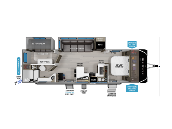 Just imagine leaving the world behind and secluding yourself away with your favorite people in your Grand Design Imagine travel trailer! The Imagine has been designed to enjoy camping and includes a high-capacity furnace, a heated and enclosed underbelly with suspended tanks, a designated heat duct to the subfloor, and a high-density roof insulation with attic vent. You'll have a large panoramic window to let natural lighting in and an adjustable Power Awning with LED Lights for those night gatherings. The exclusive drop-frame pass-through storage compartment is going to allow you to bring along lots of equipment, and the universal docking station is an all-in-one location for utilities and hook-ups. You'll also have oversized tank capacities so that you can fill and empty your tanks less often.