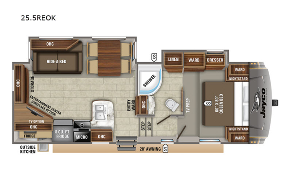 For the couple who enjoys the flexibility of getting away from the hustle and bustle of life, you will want this double slide out 25.5REOK Eagle HT fifth wheel by Jayco. Meal prep is easy in this model. The hardest decision that you will have to make is where you are going to fix your meals either inside out outside. The exterior kitchen features a refrigerator, two burner range, and an optional 32" LED TV. Outside you can also enjoy the shade from the 20' electric awning with LED lights. When you are ready to sleep you will find plenty of room in the private master suite which features a queen bed, plus the living area features a hide-a-bed sofa which offers sleeping space for two.