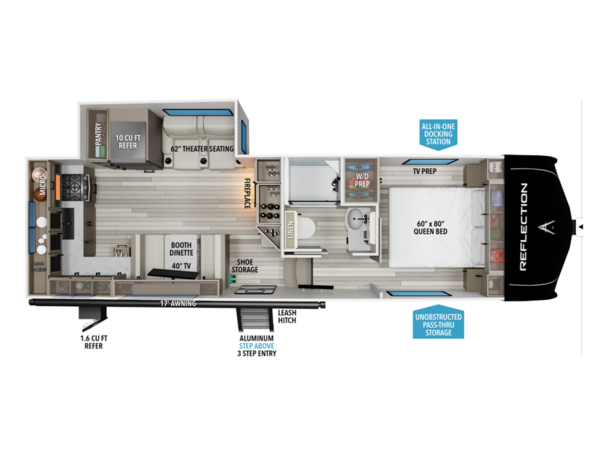 At the front of this fifth wheel, a private bedroom offers a walk-around 60" x 80" queen bed for restful comfort, complemented by dual wardrobes for convenient clothing storage. Down the hall, the full bathroom includes a 30" x 36" residential walk-in shower, a large, mirrored medicine cabinet, and linen storage for towels and toiletries. The middle living area features a cozy fireplace and booth dinette with a TV above perfect for dining while enjoying your favorite shows. Opposite, a slide-out holds the 62" theater seating for relaxing after a day of adventure, alongside a 10-cu. ft. refrigerator and pantry for all your groceries and dry goods. At the rear, an L-shaped kitchen provides generous counter space, a deep-seated stainless-steel sink, and a 30" microwave, allowing you to prepare meals comfortably without relying on campground facilities.