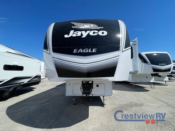 With any Eagle fifth wheel by Jayco you will appreciate durable construction materials, like the Magnum Truss Roof and the Stronghold VBL laminated walls. The JAYCOMMAND Smart RV system puts you in control of your RV's functions, and the 5 Star Handling Package will provide smooth towing from home to camp. Each model features Climate Shield zero-degree tested weather protection and the industry-exclusive HELIX cooling system that features two 15,000 BTU Whisper Quiet A/C's to keep you comfortable year around. Some of the exterior conveniences you are sure to love are the pass-through storage with Slam-Latch baggage doors and an automotive style front cap with max turn radius. The Eagle fifth wheels are designed to make you feel at home with solid hardwood slide fascia, residential vinyl flooring throughout, 100% no floor vents, and blackout roller shades with reflective side throughout for added privacy and insulation.