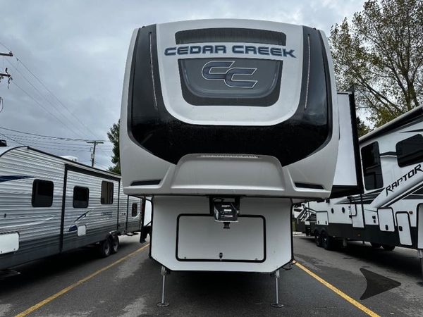 With any Cedar Creek Experience fifth wheel by Forest River, you will bet met with luxury features both inside and out! The True Gelcoat exterior is the best of the best in exteriors and the 3M bonded sidewalls will hold up over years of use. Each model includes Lippert 7,000 lb. axles with ABS brakes, Road Warrior suspension, plus TST tire pressure monitoring system to make towing that much easier. You will also find a 200 watt solar panel outside, along with a heated front storage compartment, a Nautilus P4 multi-function panel with an outside shower, black tank flush, and 12V battery disconnect, plus many more exterior conveniences. The interior will have you feeling like you haven't left home with vinyl floor coverings, Ashley furniture power theater seating, a cozy fireplace, a large bath counter, and the list of comforts goes on! Each model is also pre-wired for satellite to the roof, and you're sure to never go bored with a Smart TV in the living room and an added bedroom TV!