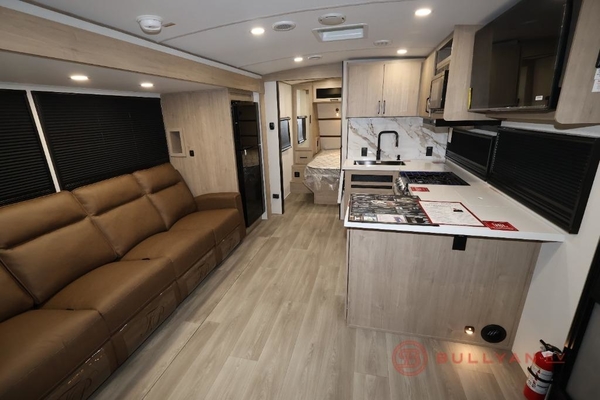 At the front of this 2810BH travel trailer, youll find a spacious full bedroom featuring a 60" x 80" queen bed, perfect for resting in comfort after a long day, along with dual wardrobes on each side to store your clothes and essentials. For added convenience, one of the two entry doors is located directly in the bedroom. Moving toward the center, the living area and kitchen create a welcoming space to relax and dine. The slide-out houses a quad theater seat, offering plenty of room to lounge, as well as a 10-cu. ft. refrigerator to keep your groceries fresh. Across from it, the U-shaped kitchen comes fully equipped with everything you need to cook comfortably, including a stainless-steel sink, three-burner range with oven, microwave, and solid surface countertops for meal prep. A bar top with stools provides a cozy dining spot, while a pull-out pantry keeps snacks organized. At the rear, the corner bathroom includes a 30" x 36" residential walk-in shower with skylight and a mirrored medicine cabinet, so you can skip the campsite facilities. Adjacent to it, the bunkhouse accommodates guests with a 36" flip-top bunk, tri-fold sofa, and even a flip-up desk, perfect for studying or remote work while on the road.