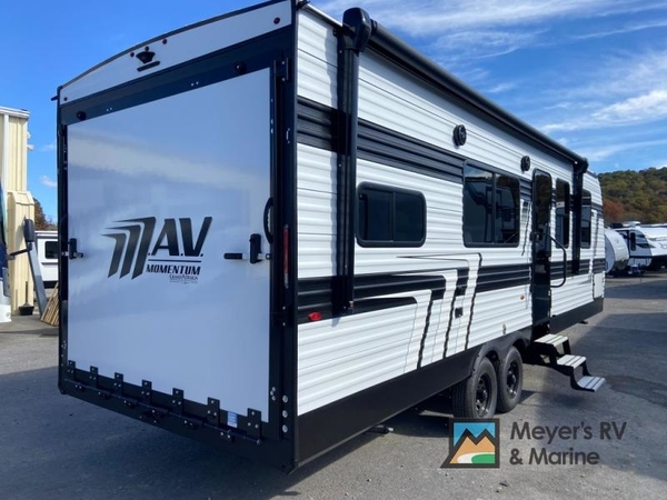 The Momentum MAV toy hauler travel trailers by Grand Design are designed to provide exactly what you need. The spacious garage provides tons of cargo space, with no wheel wells to get in the way. Additional storage includes magnetic storage door catches, and overhead consoles throughout. Conveniences like motion sensor lights and USB outlets will make your life easier, and you will be comfortable in all seasons with the 30K BTU furnace plus 15K BTU ducted air conditioning. The standard Solar Package comes with a 180W solar panel, a 40 Amp charge controller with Bluetooth, and a 12V refrigerator so you can go off-grid when the adventure calls for it.