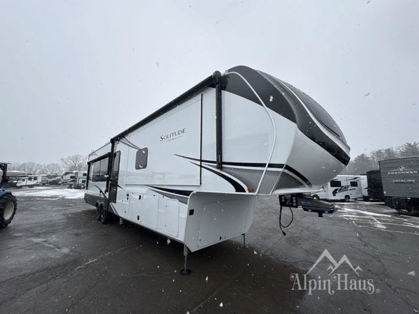 Each Solitude fifth wheel by Grand Design features a 101" wide-body construction, heavy duty 8,000 lb. axles, frameless tinted windows, and high-gloss gel coat sidewalls. You can camp year around thanks to the Weather-Tek Package that includes a 35K BTU high-capacity furnace, an all-in-one enclosed and heated utility center, and a fully enclosed underbelly with heated tanks and storage. Inside, you'll love the premium roller shades, hardwood cabinet doors, solid surface countertops, plus residential finishes throughout to make you truly feel at home. Each model also includes a MORryde CRE3000 suspension system, self adjusting brakes, and a MORryde pin box that will provide smooth towing from home to campground. Affordable luxury is possible with the Solitude fifth wheels; choose yours today!