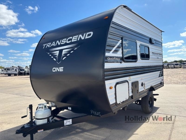 With any Transcend One travel trailer by Grand Design, you will enjoy lightweight towing thanks to their single-axle. There are many interior comforts to make camping easier than ever, such as recessed lighting, residential countertops, and a 6' 6" interior height. Each model is constructed with a heated and enclosed underbelly with suspended tanks, a moisture barrier floor enclosure, and Thermofoil over the roof and front cap for added protection. And a JBL sound system will let you listen to tunes as you visit under the power awning with a Fusion light!