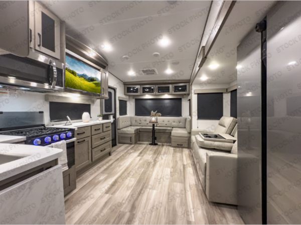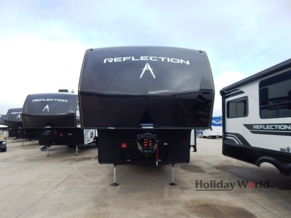 With any Reflection 150 Series fifth wheel by Grand Design, there is more available payload capacity and a broader range of half-ton trucks capable of towing this fifth wheel, and no slider hitch is needed thanks to the 90-degree turning radius which makes them short bed friendly and easier to tow. The mandatory Ultimate Power package provides a "One-Touch" automatic leveling system and a detachable power cord with LED light for easy setup, plus motion sensor pass-through lighting and entry lighting, and the Tire Linc TPMS will help you stay safe on the road. The interior offers residential luxury from the cabinetry and premium Congoleum flooring, to the booth dinette and residential-style window treatment. Make your refined decision today!