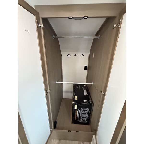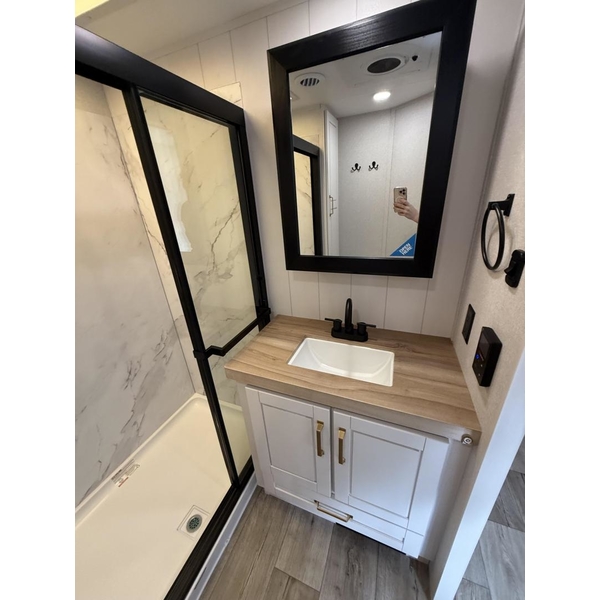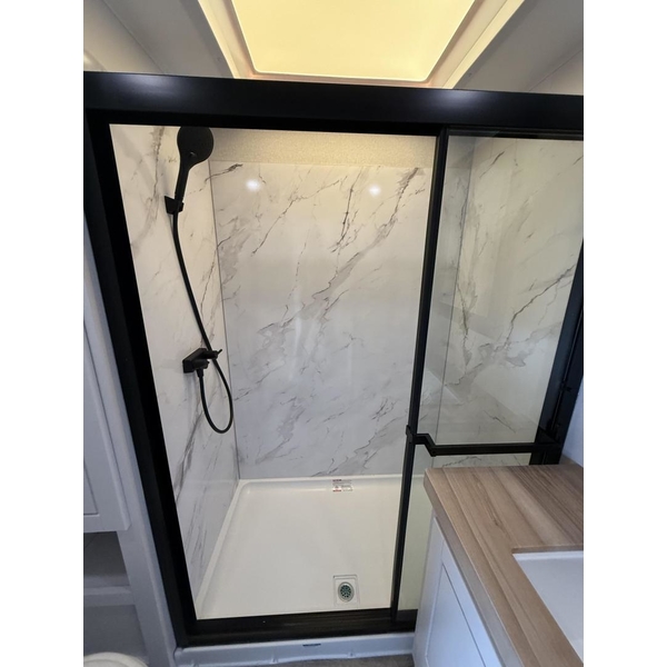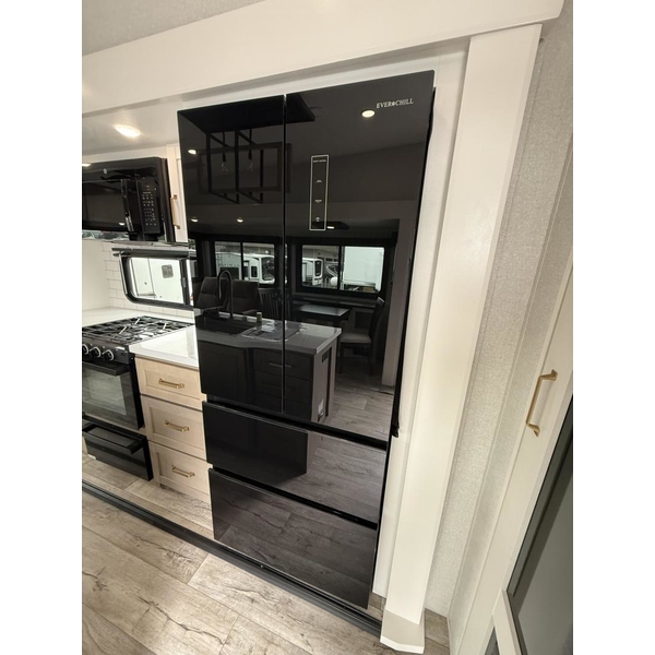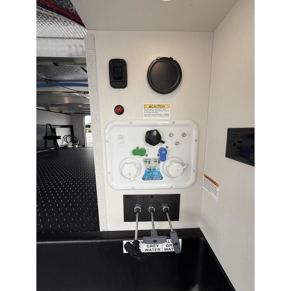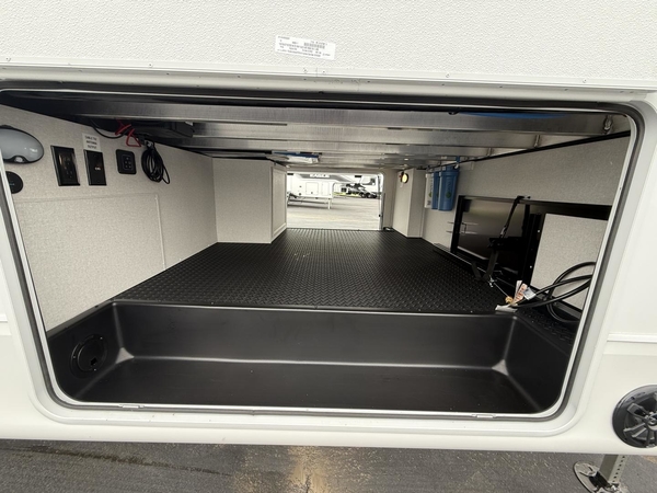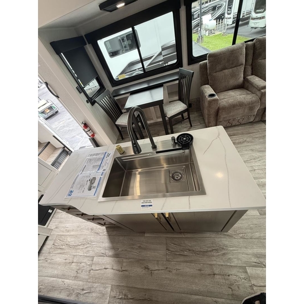 The kitchen in the Eagle is designed for culinary exploration, featuring reliable GE appliances, including a stove with an edge-to-edge grate and an easy-to-clean oven. The innovative all-in-one sink serves multiple functions, offering versatility for both preparation and cleanup. Ready for outdoor cooking? The optional Halo Griddle is perfect for your adventures, featuring a windproof design, dual-zone burner, and a temperature range from 300 to 500 degreesperfect for grilling whatever inspires you. And when the weather shifts, the foldable dinette chairs and pivoting table with an outlet below let you quickly turn the indoor office space into a cozy dining area. Set the perfect ambiance with the "Blue Sync" audio system and MB Quart speakers, delivering high-quality sound for any setting.