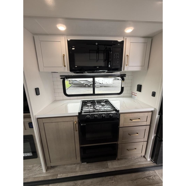 The kitchen in the Eagle is designed for culinary exploration, featuring reliable GE appliances, including a stove with an edge-to-edge grate and an easy-to-clean oven. The innovative all-in-one sink serves multiple functions, offering versatility for both preparation and cleanup. Ready for outdoor cooking? The optional Ha
