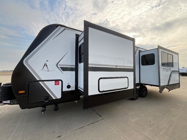 Just imagine leaving the world behind and secluding yourself away with your favorite people in your Grand Design Imagine travel trailer! The Imagine has been designed to enjoy camping and includes a high-capacity furnace, a heated and enclosed underbelly with suspended tanks, a designated heat duct to the subfloor, and a high-density roof insulation with attic vent. You'll have a large panoramic window to let natural lighting in and an adjustable Power Awning with LED Lights for those night gatherings. The exclusive drop-frame pass-through storage compartment is going to allow you to bring along lots of equipment, and the universal docking station is an all-in-one location for utilities and hook-ups. You'll also have oversized tank capacities so that you can fill and empty your tanks less often.