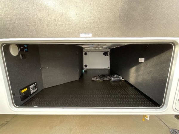 Enjoy each and every vacation, month-long trips, or even extended stays at an RV park in this spacious fifth wheel! The raised rear kitchen gives the cook plenty of room to whip up any type of meal using the stainless steel appliances including a built-in oven, an oversized pantry, and the raised bar top will provide you even more counter space on top of dining with two chairs that overlook the middle living area. Relaxing is made easy thanks to two tri-fold sofas and theatre seating while watching the big game on the LED Smart TV and enjoying the fireplace below. At night, retire to your own queen bed which slides out to provide more floor space, and you can store your clothes in the slide top dresser and front closet with washer and dryer prep.