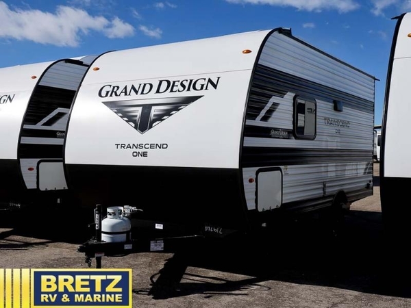 With any Transcend One travel trailer by Grand Design, you will enjoy lightweight towing thanks to their single-axle. There are many interior comforts to make camping easier than ever, such as recessed lighting, residential countertops, and a 6' 6" interior height. Each model is constructed with a heated and enclosed underbelly with suspended tanks, a moisture barrier floor enclosure, and Thermofoil over the roof and front cap for added protection. And a JBL sound system will let you listen to tunes as you visit under the power awning with a Fusion light!