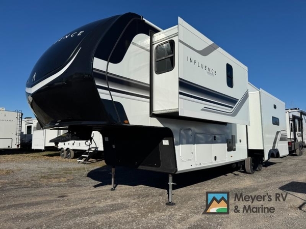Any Grand Design Influence fifth wheel features five-sided aluminum cage construction with a walk-on roof and a fully enclosed underbelly with heated tanks and storage for all weather camping. For peace of mind, the MORryde CRE3000 Suspension system will provide safe and smooth towing, and the 101" widebody construction offers all the room you need and that is before multiple slides are fully engaged. You will appreciate the Keyed-Alike locks, slam-latch baggage doors with magnetic door catches, exterior security light, and SolidStep entry steps. On the inside, Congoleum flooring, premium roller shades for privacy, a hallway handrail for safety, and nightstands with USB ports to keep all of your electronics fully charged. You will also love the On Demand tankless water heater when showering, plus the added heat and ambiance from an electric fireplace, and so much more!