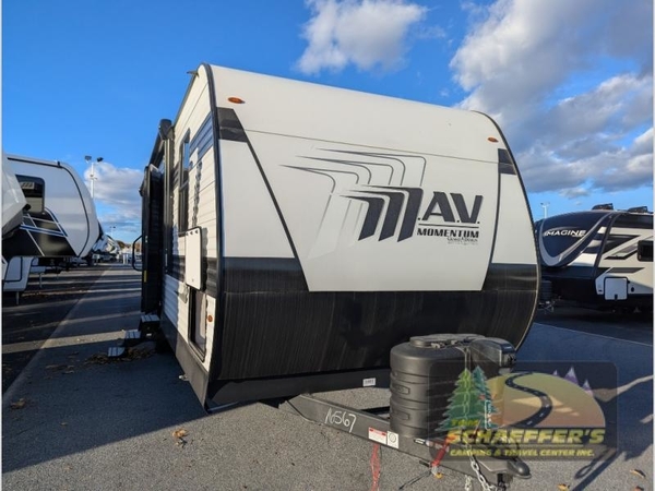 You will love this Momentum MAV toy hauler travel trailer! The front bedroom features a queen bed, and there is plenty of room to walk around. The sliding solid bedroom door helps with space. Overhead storage and a pair of nightstands are convenient storage, plus there is a wardrobe with both drawers and space to hang items. The kitchen offers a microwave, stainless steel sink, and an 8 cu. ft. 12V refrigerator. In the garage, you'll find rollover sofas with a table and a top bed for guests to sleep on. The ramp door/patio will provide additional living space once your toys are unloaded, and the pull down screen will keep bugs out!