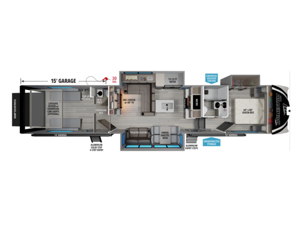 A 15' separate garage in this toy hauler offers plenty of space for your off-road toys! You will appreciate the convenience of having a full bathroom with a walk-in shower and there is washer and dryer prep so you can accommodate these appliances. You will also appreciate the two entry doors, and flip-up pet dish. The rear ramp door can even be converted into a patio, plus there are exterior speakers to keep the party going. Everyone will love hanging out in the separate living area with a fireplace at the entertainment center, theater seating, and a sectional sofa. The fully equipped kitchen has everything you need to prepare delicious home cooked meals. The front private bedroom offers an escape to rest and relax on a queen bed for the next ride!