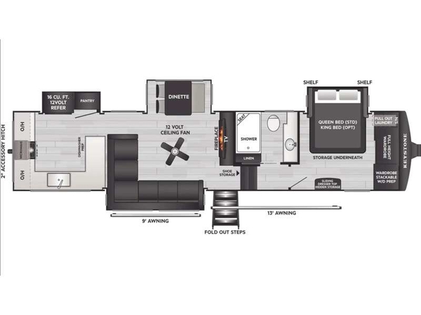 From the chassis up, the 350LLK is built to perform: an I-beam frame with stamped steel cross-members, hydraulic four-point auto leveling, heavy-duty axles, and a full-body fiberglass front cap. Outside, youll find full pass-through storage with LED lighting and power outlets, dual awnings with LED accent lighting, and industry-leading 76-gallon fresh-water capacity for extended stays away from the hookups.