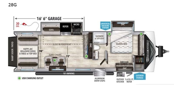 The Momentum G-Class includes an Insulation Package with a heated and enclosed underbelly, suspended tanks, high-capacity furnace, cabinet-mounted heat ducts, and moisture barrier flooringso you can camp in comfort no matter the season. A 30-gallon fuel station with interior and exterior gauges makes refueling your toys simple and convenient.