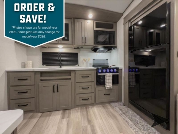 This rear kitchen fifth wheel is sure to meet all of your camping needs! Since the exterior length is only 26' 11", you can easily maneuver in and out of campgrounds. The rear kitchen includes ample counter space to prep meals, a three burner cooktop, and overhead storage for all your necessities. There is a 10 cu. ft. 12V refrigerator within the slide out that also includes the theater seating, and the U-shaped dinette provides a place to dine or play a card game. You will appreciate having convenient storage by the entry door, along with pull-out pet bowls, a functional wardrobe closet in the bedroom and an exterior pass-thru for belongings and camping gear. When you're ready to turn in for the night, the queen bed is sure to bring a great night's rest, while your guests sleep on the booth dinette or optional tri-fold sofa if you replace the theater seating!