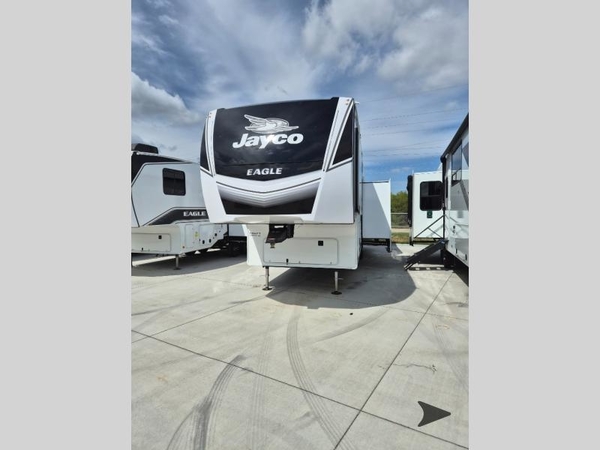 With any Eagle fifth wheel by Jayco you will appreciate durable construction materials, like the Magnum Truss Roof and the Stronghold VBL laminated walls. The JAYCOMMAND Smart RV system puts you in control of your RV's functions, and the 5 Star Handling Package will provide smooth towing from home to camp. Each model features Climate Shield zero-degree tested weather protection and the industry-exclusive HELIX cooling system that features two 15,000 BTU Whisper Quiet A/C's to keep you comfortable year around. Some of the exterior conveniences you are sure to love are the pass-through storage with Slam-Latch baggage doors and an automotive style front cap with max turn radius. The Eagle fifth wheels are designed to make you feel at home with solid hardwood slide fascia, residential vinyl flooring throughout, 100% no floor vents, and blackout roller shades with reflective side throughout for added privacy and insulation.