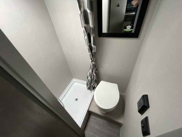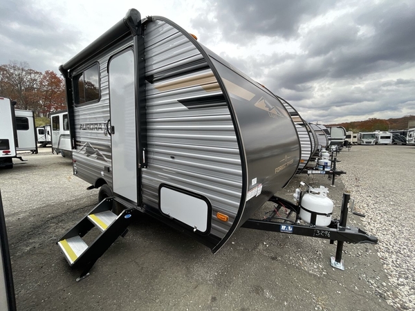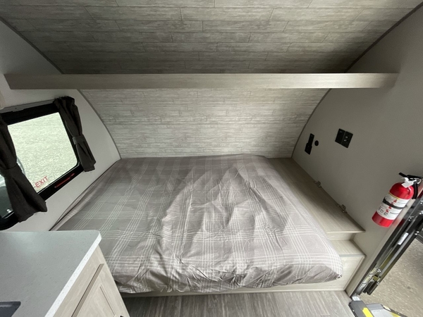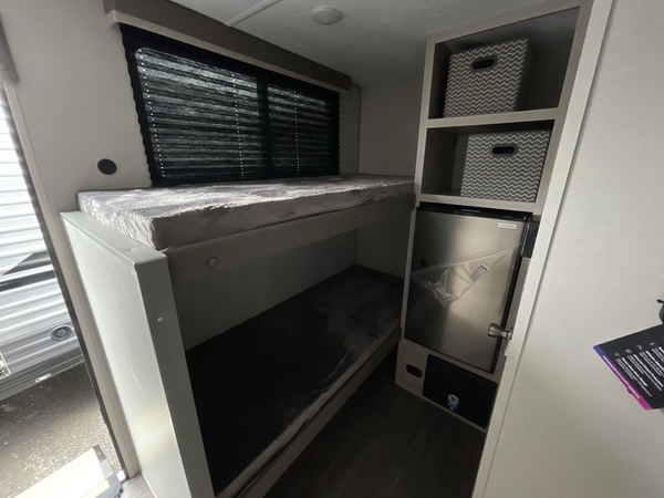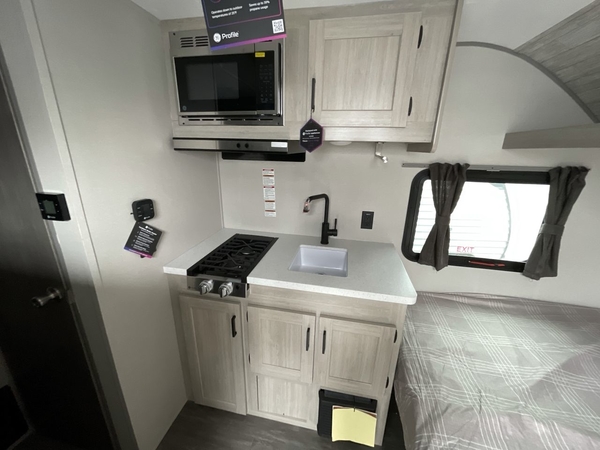 This lightweight travel trailer includes everything you need for comfortable camping trips at the lake. You can make your meals on the two burner cooktop or in the stainless steel microwave, and a 3.3 cu. ft. 12V refrigerator will keep leftovers fresh. A front queen bed provides a great night's rest, and there are 29" x 70" bunk beds for your guests or little ones. And a private bath with a 24" x 32" shower and toilet will let you easily freshen up without having to use the camp's facilities!