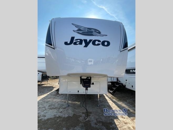 With any Eagle SLE fifth wheel by Jayco, you will enjoy a lighter tow weight, high-end finishes, and the same quality construction you've come to expect from Jayco! There is an Alpha Ply TPO roof membrane, a fully enclosed and heated underbelly, plus Stronghold VBL walls for added durability. There is also a rear 2" towing receiver outside, along with metal slam latch baggage doors, MORryde Step Above entry steps, and a Winegard Air 360 antenna with router prep if you want to stay connected as you camp. Once inside you'll enjoy the handcrafted door/drawer fronts, shower skylight, and residential vinyl flooring throughout with no carpet for an easier clean. The on-demand water heater, 30K BTU furnace, and 15K BTU "Whisper Quiet" A/C will ensure your comfort, and the Overland 1 Solar Package will provide off-grid capabilities!