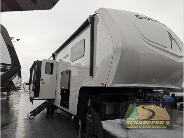 Each Solitude fifth wheel by Grand Design features a 101" wide-body construction, heavy duty 8,000 lb. axles, frameless tinted windows, and high-gloss gel coat sidewalls. You can camp year around thanks to the Weather-Tek Package that includes a 35K BTU high-capacity furnace, an all-in-one enclosed and heated utility center, and a fully enclosed underbelly with heated tanks and storage. Inside, you'll love the premium roller shades, hardwood cabinet doors, solid surface countertops, plus residential finishes throughout to make you truly feel at home. Each model also includes a MORryde CRE3000 suspension system, self adjusting brakes, and a MORryde pin box that will provide smooth towing from home to campground. Affordable luxury is possible with the Solitude fifth wheels; choose yours today!