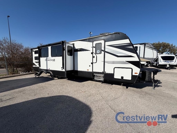A great travel trailer for larger families or those that enjoy traveling with a few friends! This Imagine quad bunk model features two private bedrooms, with the master up front including a private entry/exit door just beyond a spacious walk-through bathroom that features a 30" x 36" shower with skylight to bring in more natural lighting each day, plus a toilet, sink and linen storage. In the kitchen, a nice island for food prep and cleaning up makes it easy to be part of the conversation in the room while you get meals ready for everyone. Speaking of food prep, how about the outside griddle and 1.6 cu. ft. refrigerator which is perfect for cooking outside, or for making late night snacks when all are enjoying the evening under the stars or in lawn chairs under one of two 9' 6" awnings with LED lighting. Your kids can bring along extra guests with the added sleeping that a quad bunk model provides. And, there is plenty of storage in the private bunkroom with drawers beneath for their things, plus a rear baggage door that is 42" x 22" for even more storage space for extra toys and gear.