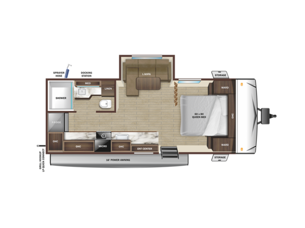 You and your spouse will enjoy camping in this travel trailer! The L-sofa slide out provides more space to stretch out and relax, and there is a table with it to enjoy your meals. This model includes a rear corner kitchen with plenty of counter space, a 10 cu. ft. 12V refrigerator, plus a three burner range with a 17" oven. Get a good night's rest each night on the front queen queen bed with wardrobes on either side and a privacy curtain to draw for added privacy. You will find a grill hookup LP quick connect outdoors plus an exterior docking station and a sprayer hose, and a pass-through storage for hiking and fishing gear!