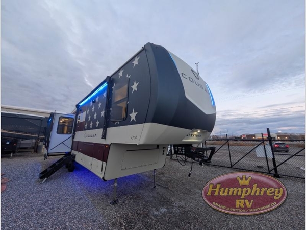 Spend more time having fun and less time worrying about your RV with the Keystone Cougar fifth wheel! These units have all that you will need for excellent vacations. The interior comes with 5/8" one-piece DynaSpan® flooring, tall slide outs for added comfort and head room, night roller shades throughout, and residential, shaker style hardwood cabinet doors and drawers. You will also enjoy decorative crown molding, a 5,500 BTU electric fireplace with thermostat control and remote, and a Max Air exhaust fan with rain sensor. The exterior is also fully outfitted with a convenience center, friction-hinge entry door, electric four-point auto leveling system, and slam-latch baggage doors. Each model is available with the optional Hero Edition. By choosing this edition, you can help support our nation's heros and their families by contributing to the Wounded Warrior Project. This optional package features an industry exclusive full-body paint matte finish, frameless windows, a glass entry door, blackout rims, and green LED exterior accent lighting; see dealer for more details!