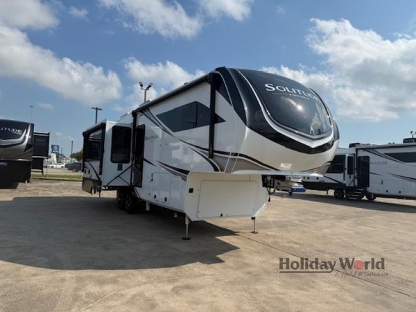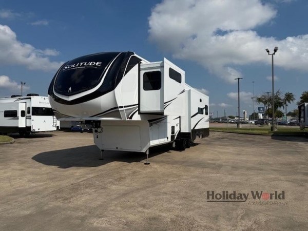Each Solitude fifth wheel by Grand Design features a 101" wide-body construction, heavy duty 8,000 lb. axles, frameless tinted windows, and high-gloss gel coat sidewalls. You can camp year around thanks to the Weather-Tek Package that includes a 35K BTU high-capacity furnace, an all-in-one enclosed and heated utility center, and a fully enclosed underbelly with heated tanks and storage. Inside, you'll love the premium roller shades, hardwood cabinet doors, solid surface countertops, plus residential finishes throughout to make you truly feel at home. Each model also includes a MORryde CRE3000 suspension system, self adjusting brakes, and a MORryde pin box that will provide smooth towing from home to campground. Affordable luxury is possible with the Solitude fifth wheels; choose yours today!