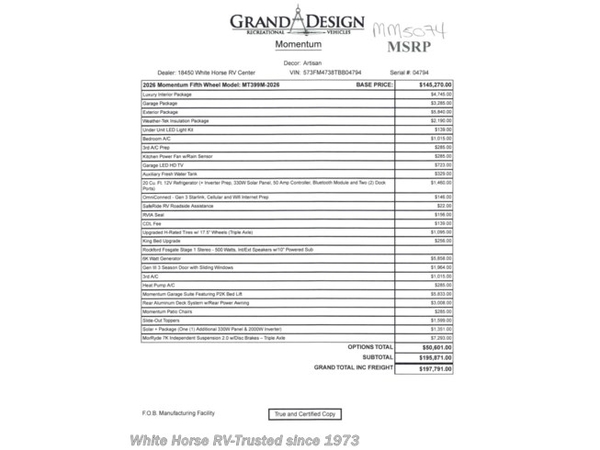 2026 Grand Design Momentum 399M Fully Equipped, Luxury Toy Hauler