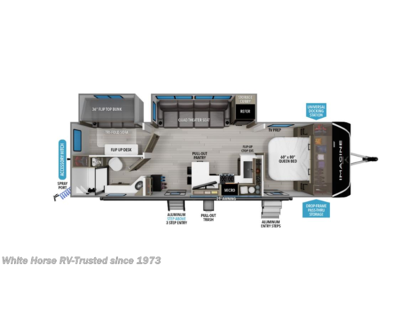 21' power awning, aluminum entry steps, spray port, accessory hitch, and drop-frame pass-thru storage
