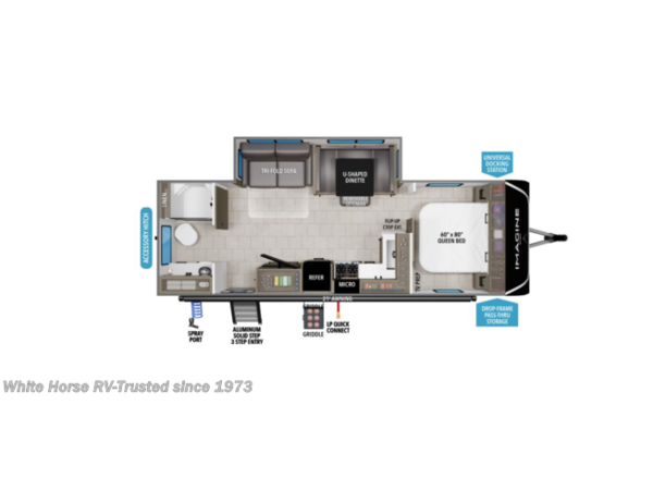 Drop-frame pass-thru storage, universal docking station, and premium Imagine construction designed for durability and extended-season camping